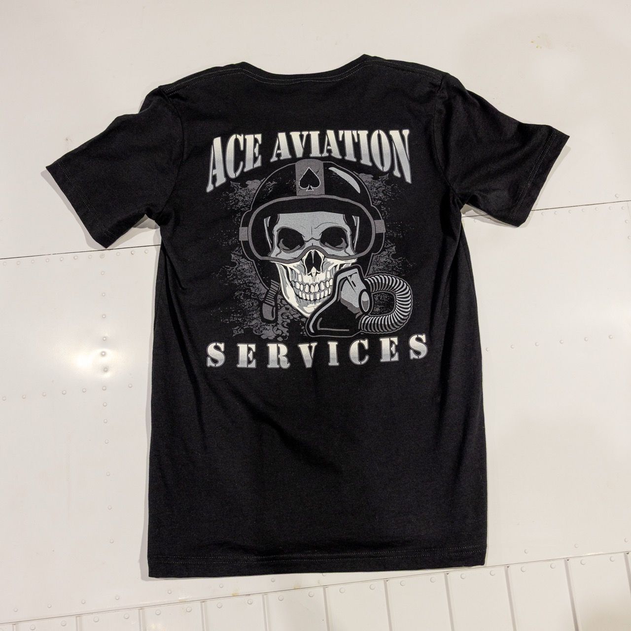 Ace logo on front, skull aviator design on back. Black color. Soft cotton/poly blend.